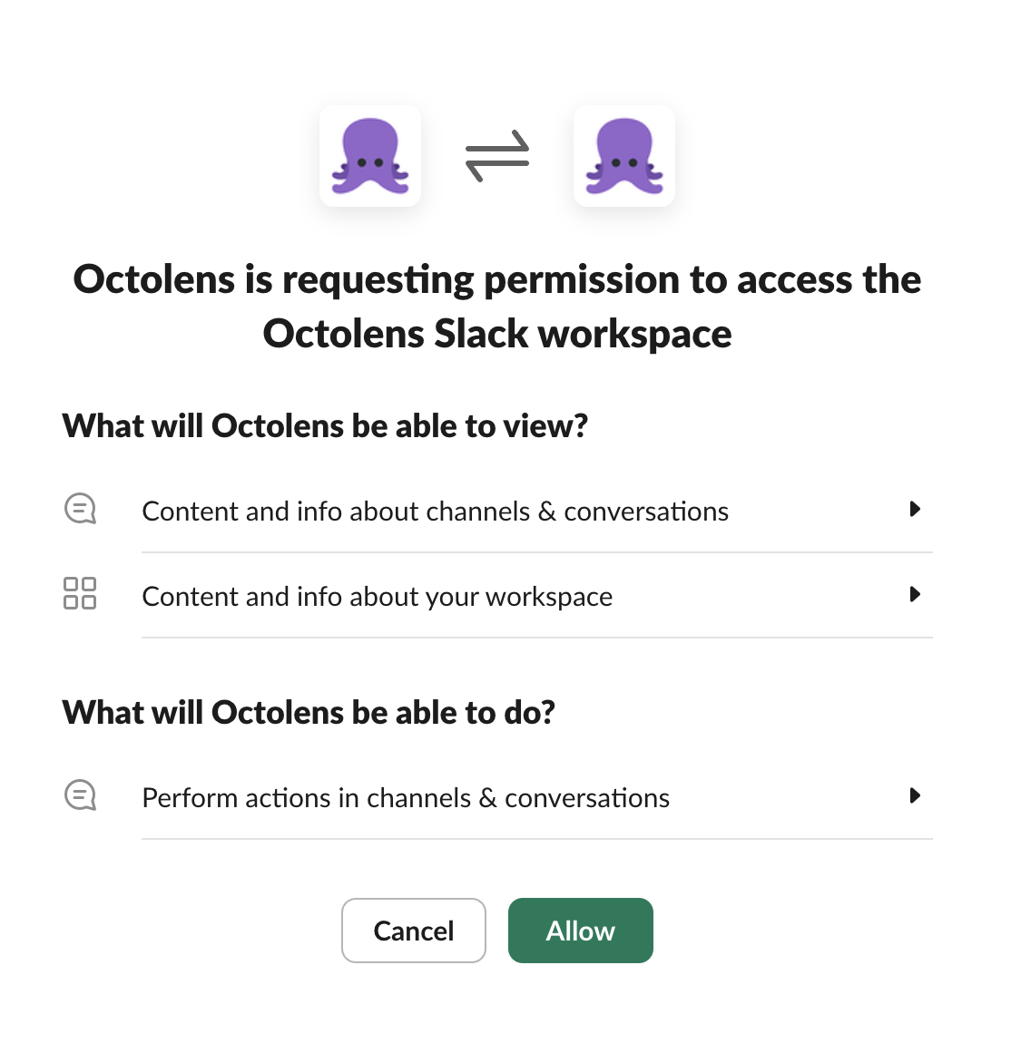 The Octolens app for Slack only requires permissions to post messages in channels you specify. It doesn't read your conversations or access any other data in your Slack workspace.