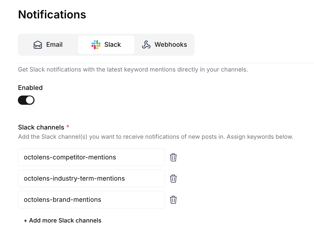You can connect as many Slack channels as you need. Each channel can be configured to receive different types of mentions based on your keywords and monitoring preferences.